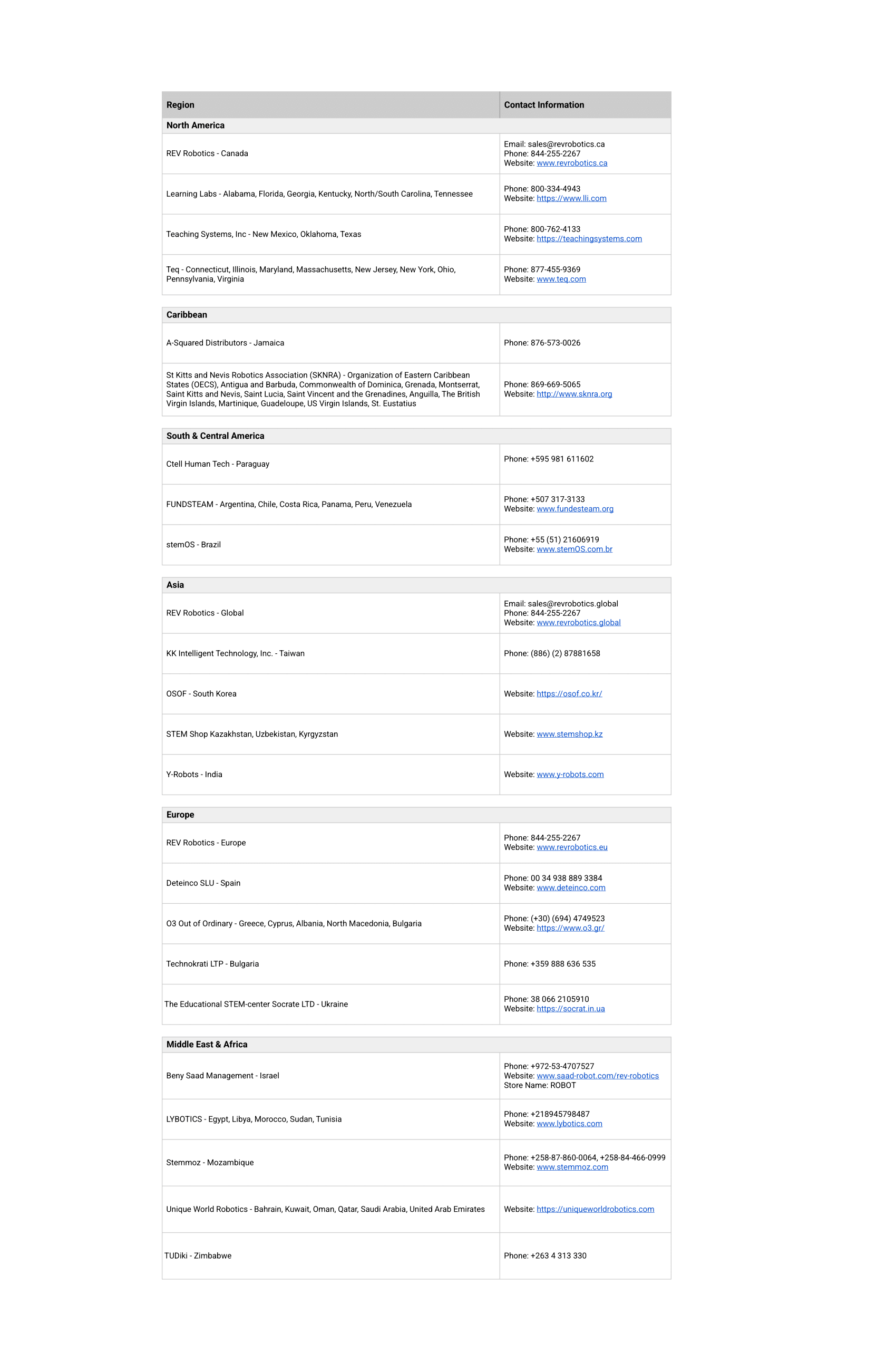 REV Robotics also has authorized distributors located around the world. Check out the table below or contact sales@revrobotics.global for more information. If you are interested in becoming a distributor, reseller, or partner, please visit our partner program page to apply!